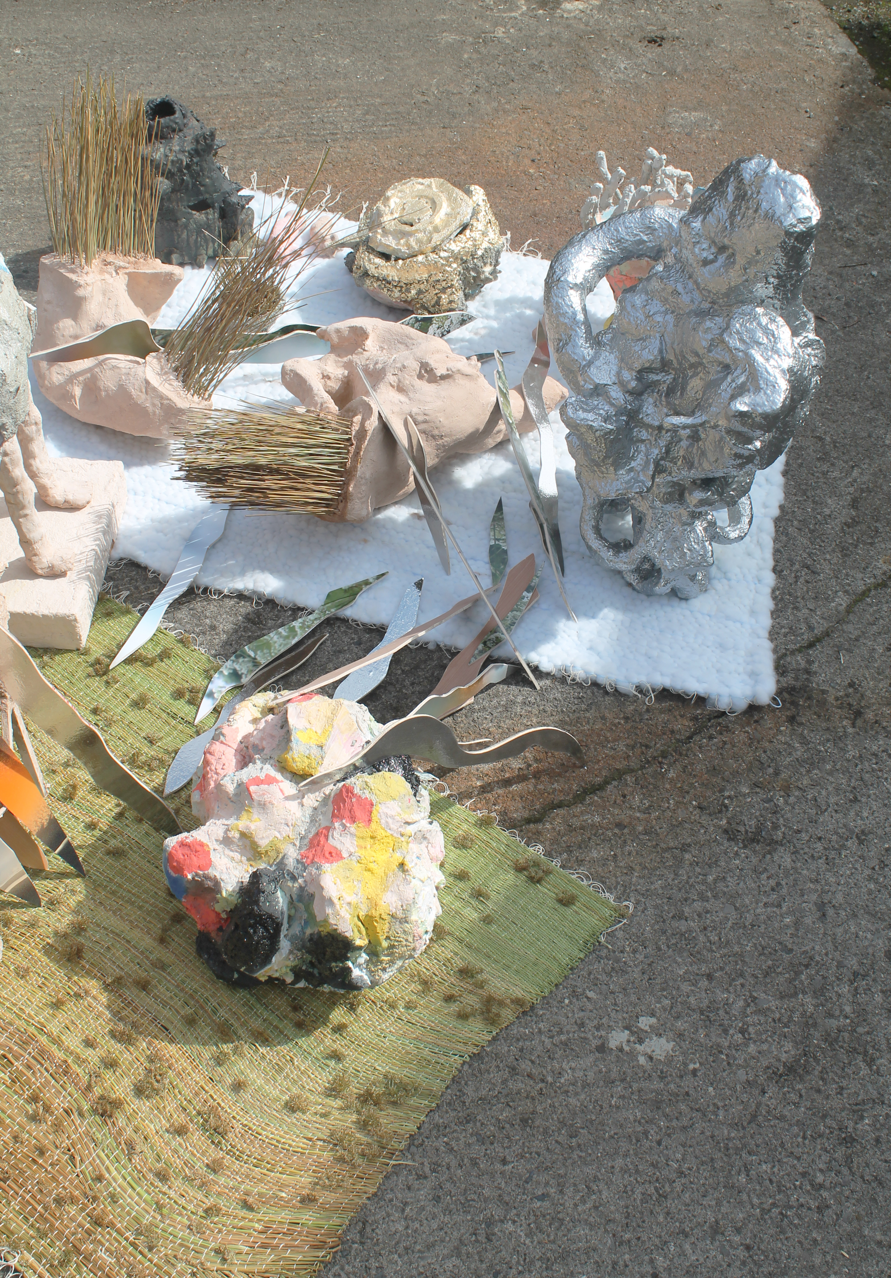 Plaster, woven rushes, woven polyester, paper pulp, cardboard, wood, expanding foam, cement, gold leaf, paint, wire, digital print, glitter